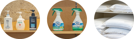 色々な種類の枕とボディーソープとシャンプー等の貸出品をロビーに準備しております。数に限りがありますので先着順となります。